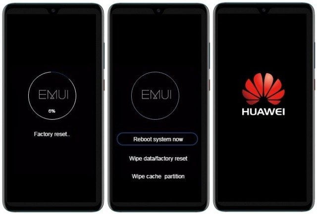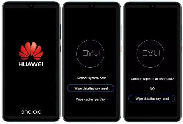 4 – E solte quando entrar no menu EMUI. Neste menu, toque na opção “Wipe data/factory reset“.