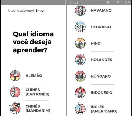 Depois que instalar o app do Drops no seu telefone Android ou iOS, será exiba a tela com a lista dos idiomas disponíveis para você escolher e começar imediatamente o aprendizado do seu idioma preferido. Você pode usar o app como convidado, conectado na sua conta do Facebook, Google ou fazer a inscrição usando seu endereço de e-mail.