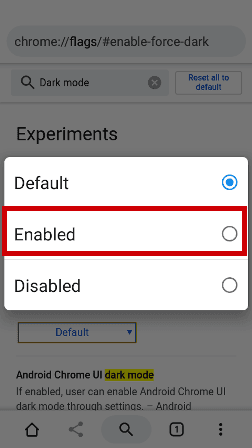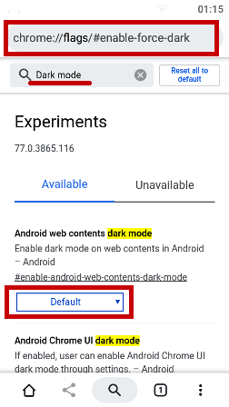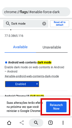 Abra o navegador do Google Chrome no seu dispositivo móvel e digite na barra do endereço “chrome: // flags / # enable-force-dark” toque em “Ir“. Na página Experiments, digite “Dark mode” na caixa de pesquisa. No primeiro resultado “Android web contents dark mode” toque em “Default” para abrir o pop-up.