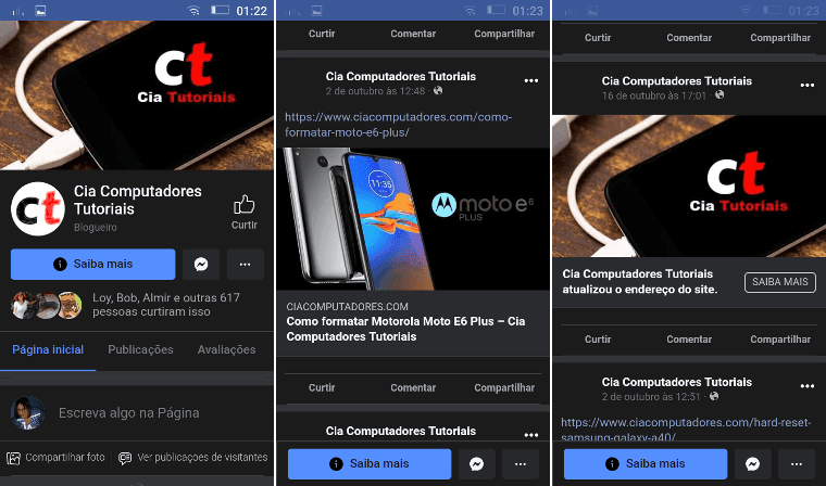 Abaixo algumas imagens da aparência do perfil da nossa página depois de aplicado o procedimento do modo escuro alternativo.