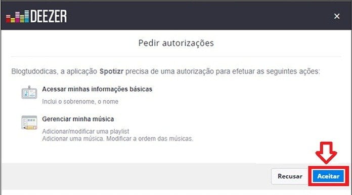 Passo 6 – Clique em “Aceitar” na janela que se abrir para poder autorizar a importação da playlist para o Deezer.
