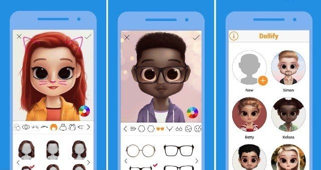 O primeiro em destaque é o aplicativo Dollify, com vários recursos, os utilizadores poderão criar o seu avatar usando os itens disponibilizados nas seções iniciais do app, como por exemplo, tipos olhos, cor da cútis, cabelos e o formato do rosto.