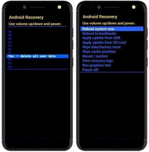 5 – Na tela seguinte, selecione com com a tecla de volume a opção “Yes–delete all user data” e pressione o Power e aguarde um momento…..