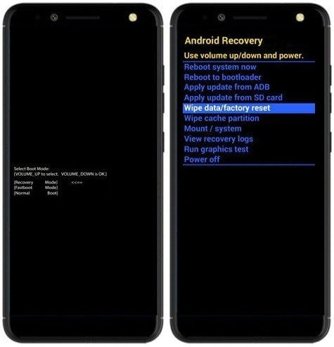 4 – No menu do Android Recovery, navegue com o botão de Volume Baixo para selecionar “Wipe data/factory reset” e confirme com o botão Power.