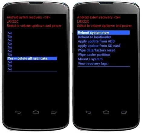 7 – Agora novamente com a tecla de Volume Menos desça até selecionar a opção “Yes-delete all user data” e confirme com o Power.