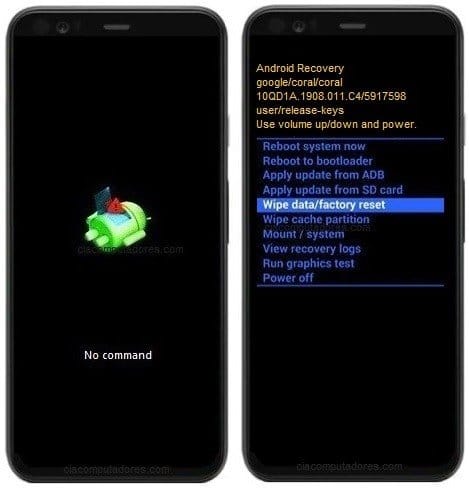 5. Aqui no menu do Android Recovery, pressione o Vol- para descer até a opção “Wipe data/factory reset” e depois pressione o Power.