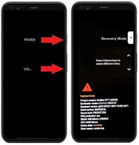 3. Nesta tela, pressione algumas vezes o botão de Vol +/- até surgir a opção “Recovery Mode” e em seguida, pressione o Power para confirmar (imagens das telas abaixo).