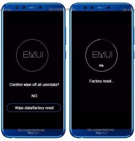 5 – Na tela seguinte selecione novamente Wipe data/factory reset e confirme outra vez com o Power. Feito isso, o processo de Factory reset no Honor 9 será iniciado. Espere carregar em 100%.