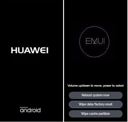2 – Pressione os botões de Volume Mais (Up) + Liga/Desliga (Power). Continue pressionando os 2 botões até visualizar o logotipo EMUI (veja na imagem abaixo) e aguarde entrar na tela do menu.