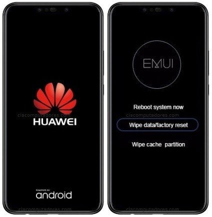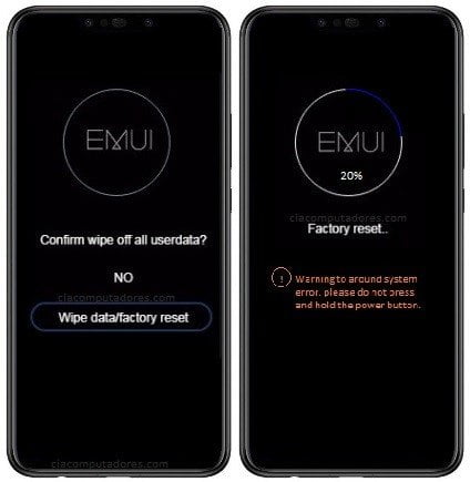 4 – Na tela do menu EMUI, toque na opção “Wipe data/factory reset“. Na etapa seguinte, toque novamente em “Wipe data/factory reset“.