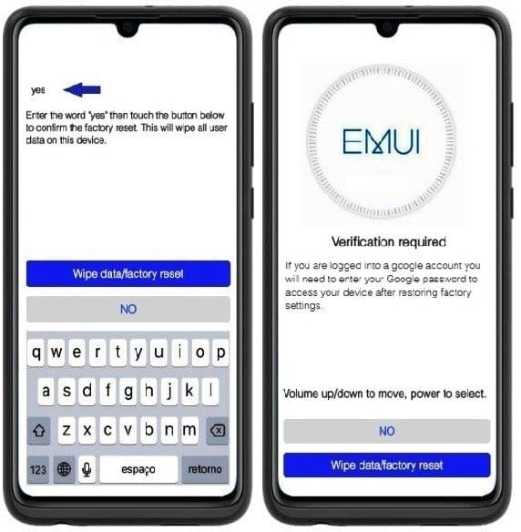 4 – Na tela seguinte, digite a palavra “yes” usando o teclado virtual e depois selecione a opção “Wipe data/factory reset” usando o Volume para Baixo e depois confirme novamente com o Power.