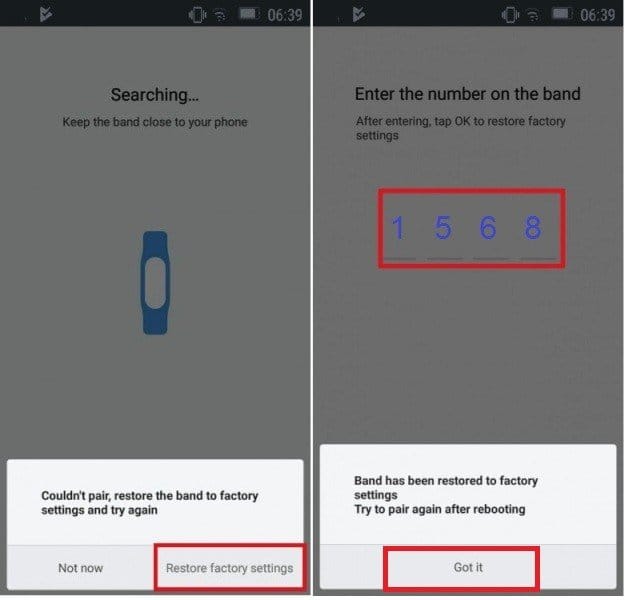 5 – Quando aparecer a tela da imagem abaixo, toque em “Reset factory settings” para resetar as configurações. Em seguida será exibido o código do PIN na tela da sua Mi Band 3. Digite no campo indicado e toque em “Got it“.