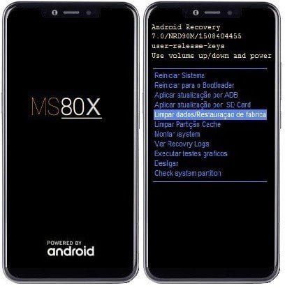 3 – Aqui neste menu, use o botão de Volume– para selecionar “wipe data/factory reset” ou “Limpar dados/Restauração de fábrica” e pressione o Power para confirmar.