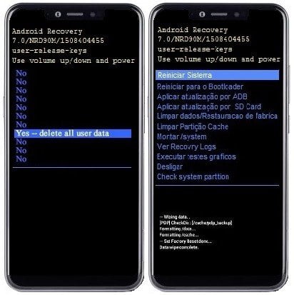 4 – Na tela seguinte, navegue com o botão de Volume– até a opção “Sim” ou “Yes–delete all user data” e confirme com o Power. Espere a formatação interna do seu aparelho ser concluída.