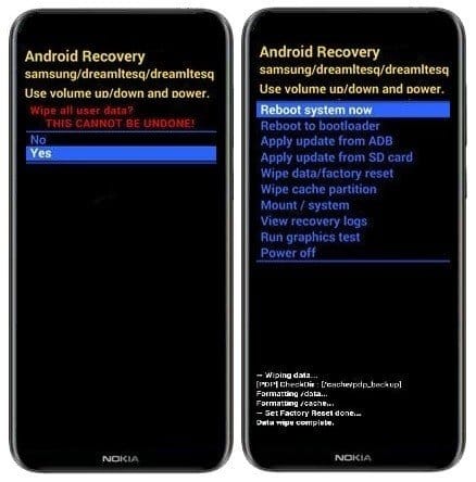 6 – Depois que formatação da memória interna acabar e volta para o menu inicial, apenas pressione o Power para reiniciar o Nokia X7 2018 confirmando na opção “reboot system now“.