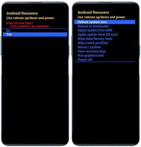 4 – Aqui navegue com a tecla de Diminuir Volume até a opção “Wipe data/factory reset” e depois pressione a tecla Power.