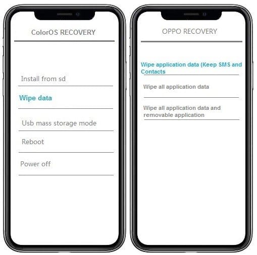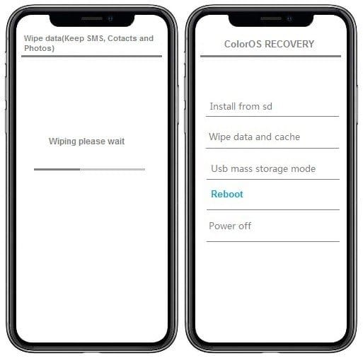 4 – Na tela Oppo Recovery, toque na opção “Wipe data(Keep SMS, Contacts and Photos)” e confirme em “OK” e aguarde concluir a formatação.