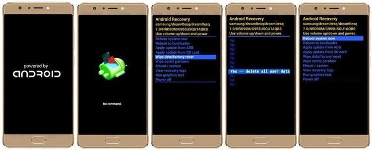 Neste menu, desça com o o botão de Volume para baixo até selecionar a opção “Wipe data/factory reset” e depois pressione o Volume para cima para confirmar.