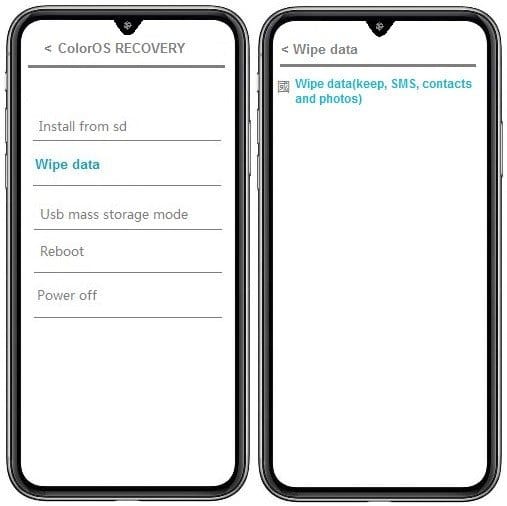 4 – Na tela seguinte, toque na opção “Wipe data“, depois em “Wipe data(keep, SMS, Contacts and photos)“e confirme em “OK“.