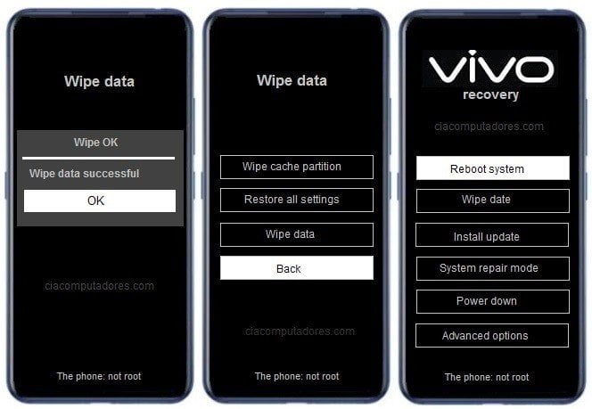 8 – Agora toque em “Back“. De volta a tela da Vivo recovery, toque em “Reboot system“.