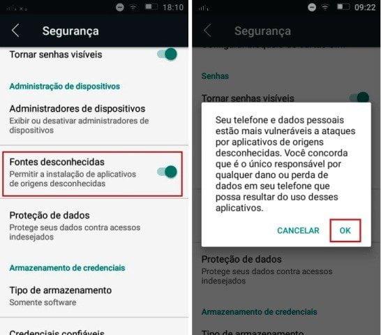 Importante: Para garantir que seu aparelho fique sempre protegido, DESATIVE a chave de Fontes Desconhecidas depois que a instalação e a configuração esteja completa.