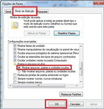 2 – Nas “Opções de Pasta”, clique na aba “Modo de Exibição” e depois marque a opção “Mostrar arquivos”, pastas e unidades ocultas e clique em “OK”.
