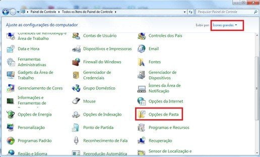 1- Acesse o “Painel de controle” depois clique em “Exibir” por e selecione “Ícones Grande” e então clique em “Opções de Pasta”.