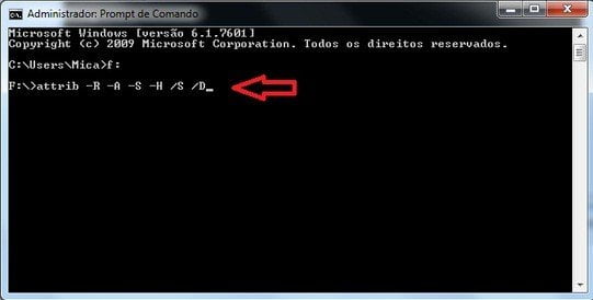 7 – Agora digite o comando “attrib -R -A -S -H /S /D” e aperte “Enter”, espere o processo terminar.