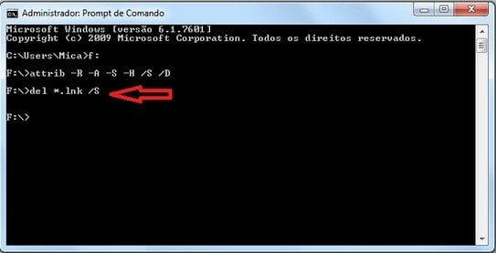 8 – Para terminar digite “del *.lnk /S” e novamente aperte “Enter”, isso fará com os atalhos criados pelo vírus sejam eliminados.