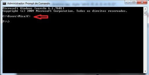 6 – No prompt digite a letra “F:” seguida dos 2 pontos (:) ou a letra que representa a unidade USB onde esta o pendrive e então aperte “Enter”.