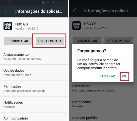 5 – Agora volte para tela anterior, toque em “Forçar Parada” e confirme em “Forçar Interrupção” ou “OK“.