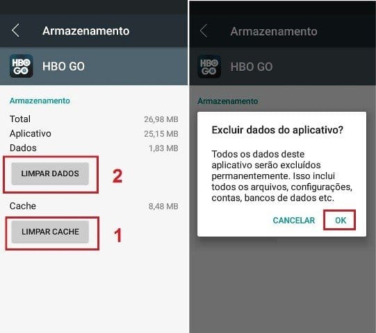 4 – Na tela seguinte, toque em “Limpar Cache“, depois em “Limpar Dados“. Uma janelinha se abrirá informando que todos os arquivos e definições do banco de dados serão apagados, então clique em “OK” ou “Apagar“.
