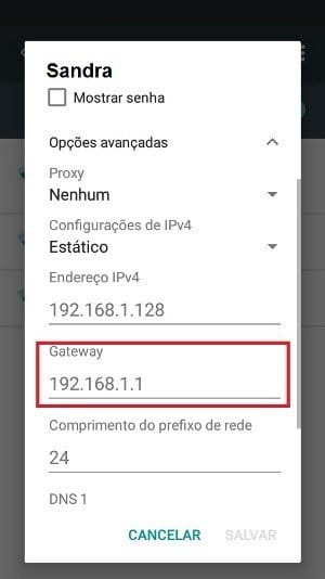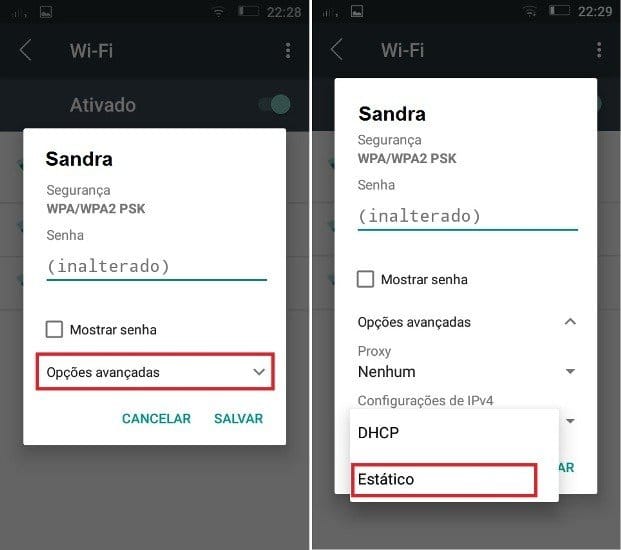 2 – Ainda neste pop-up, clique na setinha ao lado de “Opções avançadas” para expandir o pequeno menu. Na seção de configurações de IPv4, toque na seta da opção”DHCP” para expandir e depois selecione “Estático“.