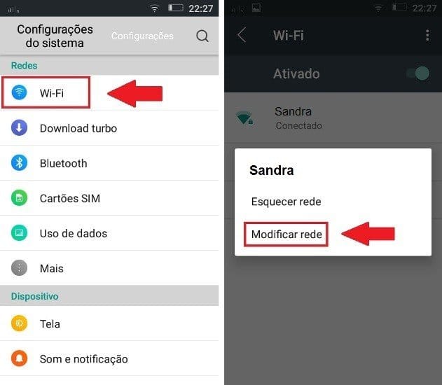 1 – No seu smartphone entre em “Configurações” e depois selecione a opção de “Wi-Fi“. Depois pressione o dedo por alguns sobre o nome da rede em que você está conectado com a internet. No pop-up que abrir, toque em “Modificar rede“.