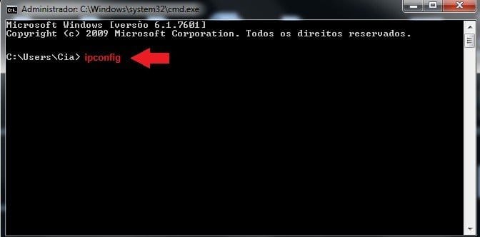 2 – Apos isso, uma janela preta se abrirá (DOS). Então digite o comando “ipconfig” e aperte “Enter“.