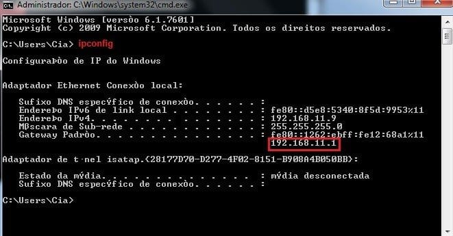 3 – Você verá no número de ip do seu roteador na última linha do gateway padrão, como na imagem abaixo.