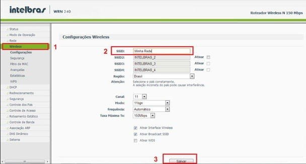 3 – Agora foi liberado para você acessar as configurações do roteador Intelbras. (1) Clique no lado esquerdo na opção “Wireless“. (2) Em “SSID” coloque ou troque o nome da sua rede wifi. (3) Clique em “Salvar“.