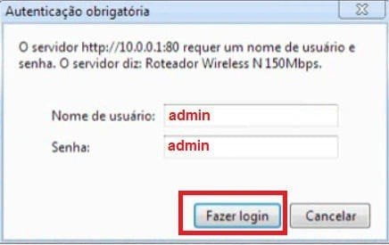 2 – Nesta janelinha que apareceu no centro da página, digite “admin” no campo “Nome de usuário” e faça o mesmo no campo da Senha e em seguida clique em “Fazer Login“.