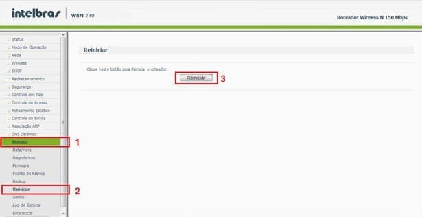 5 – Para que estas alterações feitas tenham efeito, será preciso reiniciar o roteador Intelbras. (1) Clique em “Sistema” e depois abaixo (2) clique em “Reiniciar” e por fim novamente (3) clique em “Reiniciar“.