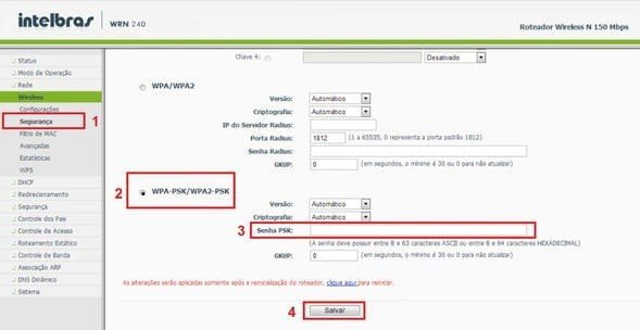 No campo (3) “Senha PSK“, digite a senha (anote-a para não esquecer) desejada para sua rede, ela deve ter de 8 a 63 caracteres (letras, números ou símbolos). Finalize clicando em “Salvar“.